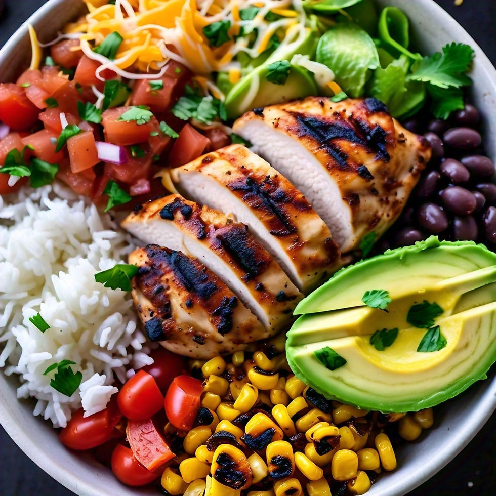 Layer rice with seasoned grilled chicken, avocado, black beans, corn, and a sprinkle of cheese.